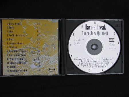 Unsere CD "Have a break" (2010) erhalten Sie für CHF 16.00 mit der Post oder an unseren Konzerten direkt bei der Band für CHF 15.00. Gesamthaft dreizehn Nummern; elf Jazz- und Latin-Standards sowie zwei Kompositionen unseres Gitarristen, Peter Frey. Ueber siebzig Minuten Musik von powerful bis balladesk, jazzig, bluesig, latiniert, viele Strömungen ergeben den aktuellen Sound der Band. Lassen Sie sich überraschen!