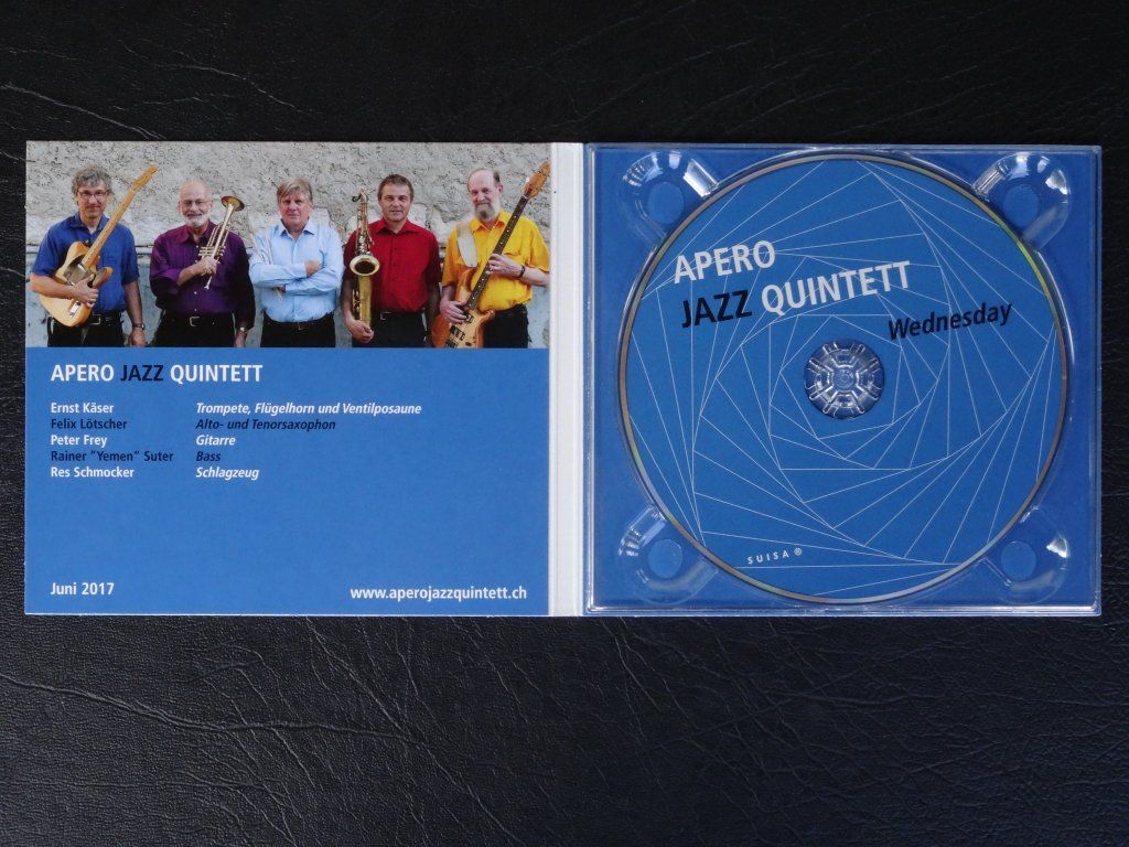 Unsere CD "Wednesday" (2017) erhalten Sie für nur CHF 20.00 mit der Post oder an unseren Konzerten direkt bei der Band für nur CHF 20.00. Gesamthaft fünfzehn Nummern Jazz- und Latin-Standards sowie eine sehr interessante Komposition unseres Gitarristen, Peter Frey. Fast 80 Minuten Jazz, Latin, Blues, Funk,...... mit viel Energie und Verve gespielt!